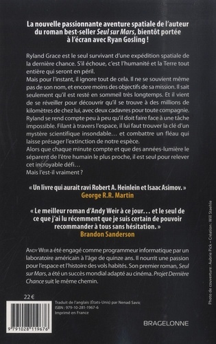 L’espoir de l’équipe réside dans des échantillons rapportés d’une sonde de la planète Vénus. Mais tout ne marche pas rondement. Un matin, Ryland Grace se réveille fin seul dans le vaisseau. Ses coéquipiers sont morts. Il doit se consacrer entièrement à sa mission, seul…pour un temps…car il fera une rencontre très étrange. Le défi demeure le même : empêcher l’extinction de l’espèce humaine.