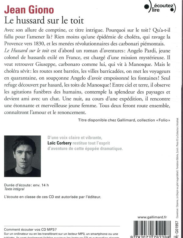 Extrait : LE HUSSARD SUR LE TOIT, de Jean Giono. Édition de papier : Gallimard éditeur, 1995, 498 pages. Format numérique : Gallimard éditeur, 2013, 490 pages, 1109 KB, version audio : Gallimard éditeur, 2019, durée d’écoute : 14 heures 4 minutes. Narrateur : Loïc Corbery.