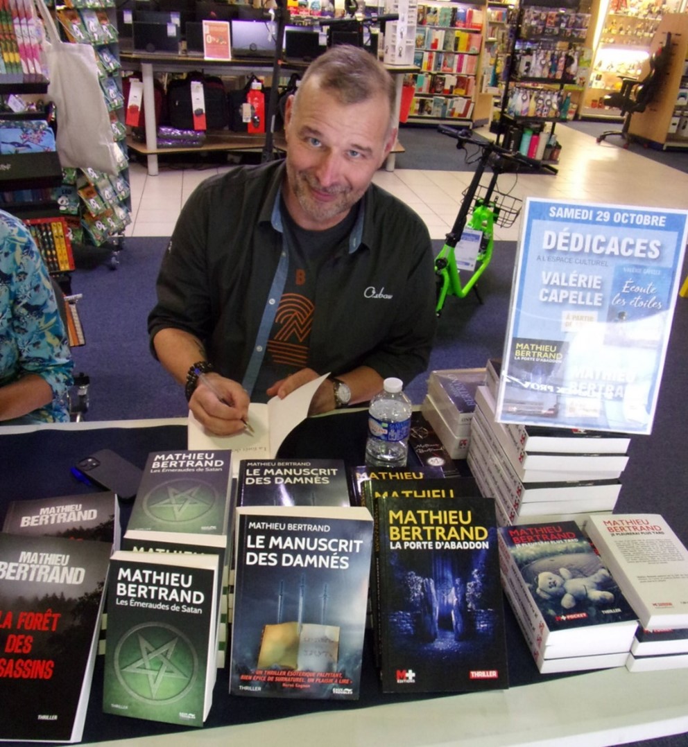 L’auteur Mathieu Bertrand et quelques-uns de ses livres